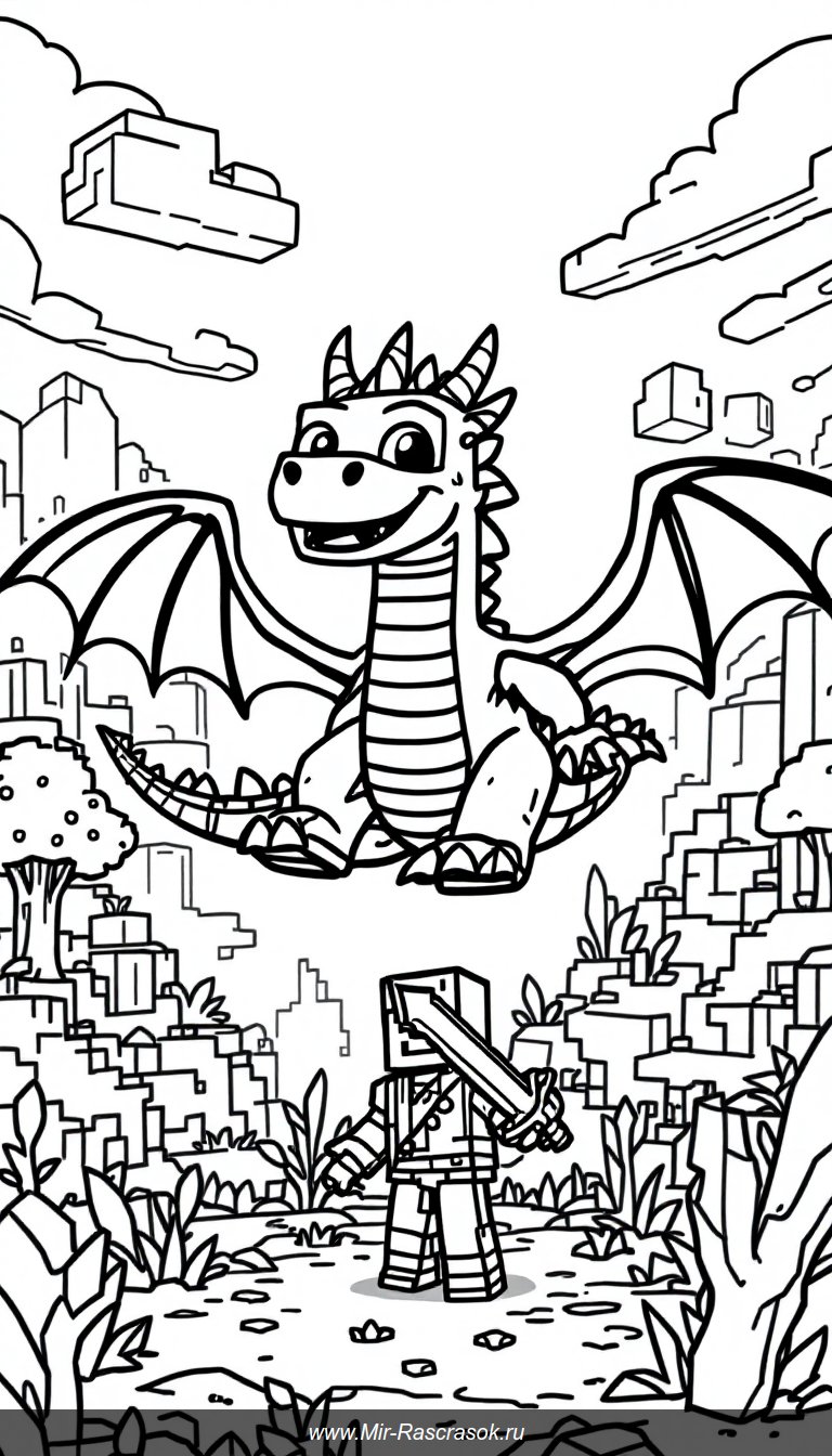 Погрузитесь в захватывающую битву с Драконом Края в Майнкрафт 🌟 Эта раскраска дарит веселую и дружелюбную сцену с героем и драконом 🐉 Легкие контуры и большие блоки делают изображение идеальным для детей 🎨 Развивайте творческие навыки и наслаждайтесь миром Minecraft вместе с нашей раскраской 🖍