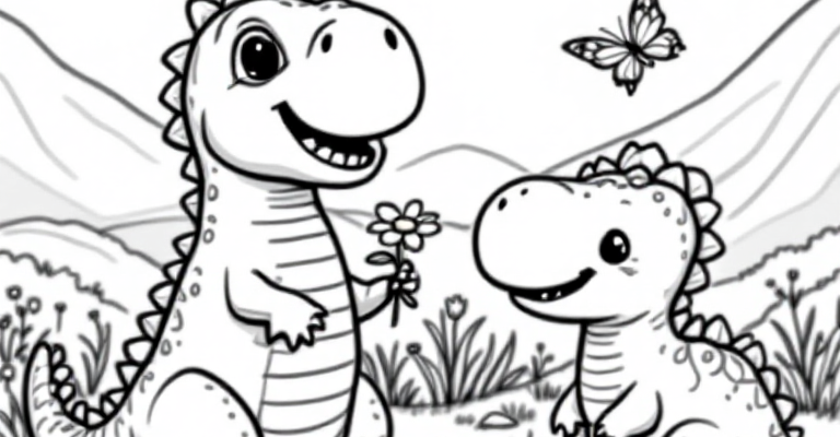 Погрузитесь в мир малышей динозавров с нашей раскраской 🌿🦕 Три дружелюбных динозаврика играют на лугу среди цветов и бабочек 🦖 Сделайте процесс творчества