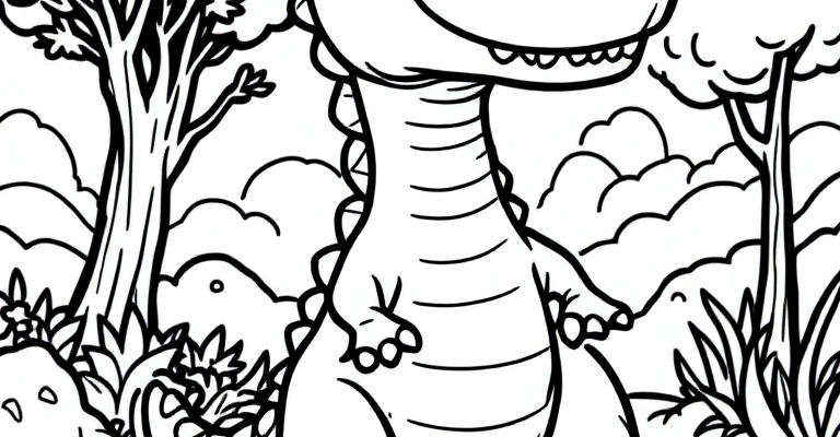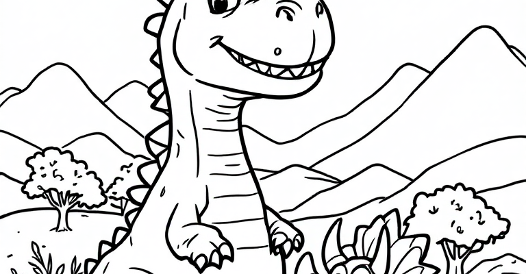 Откройте для детей удивительный мир с раскраской дружелюбного Тираннозавра 🦖✨ Простая и веселая сцена поможет развить творческие навыки и подарит массу