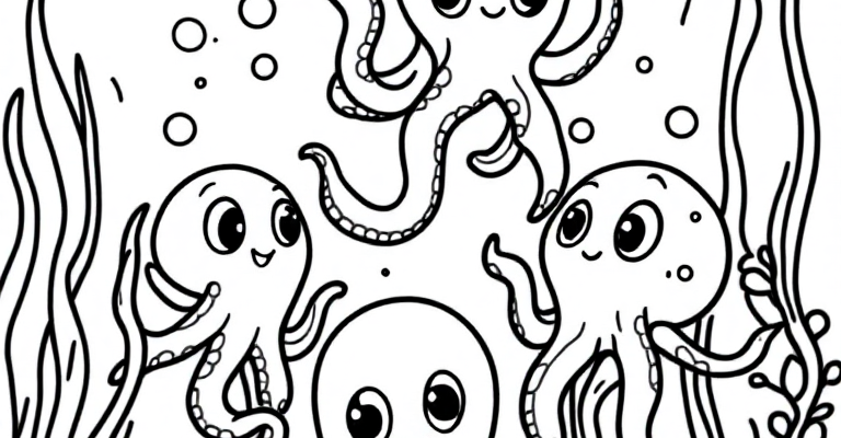 Познакомьтесь с весёлыми осьминожками друзьями в нашей раскраске для детей 🐙🖍️ Простая и забавная картинка несёт радость и творческий настрой для малышей