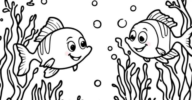 Погрузитесь в веселый подводный мир рыбок 🐠 и разнообразных морских обитателей, раскрашивая эту простую и дружелюбную картинку 🖍️ Отличное занятие для