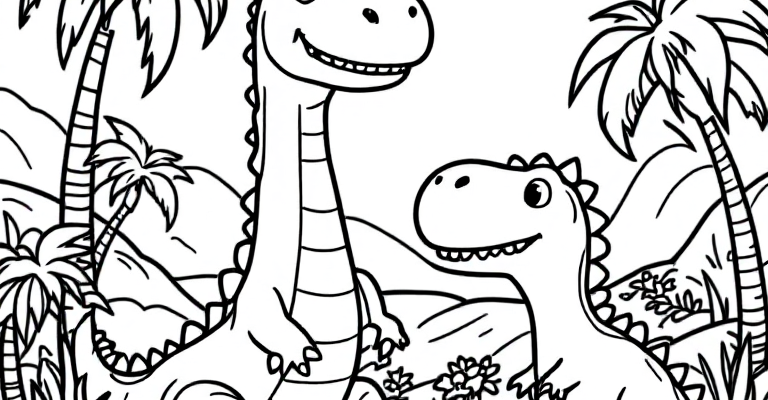 Откройте мир веселых динозавров с нашей раскраской для детей 🦖🌞 Простые и дружелюбные персонажи на фоне природы помогут развить творчество и подарят радость