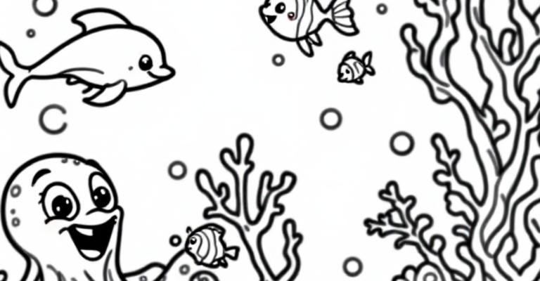 Погрузитесь в увлекательный подводный мир с нашей раскраской для детей 🐬🌊 веселые морские обитатели и простые детали помогут развить фантазию и творческие