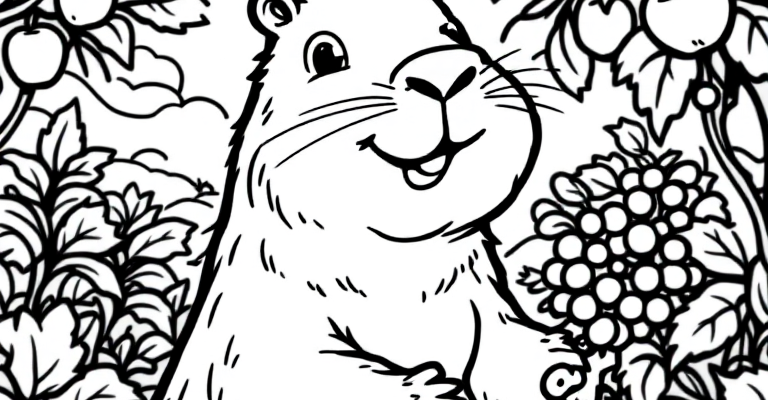 В этом милом раскраске капибара собирает вкусные фрукты и ягоды 🍓🍎, окруженная зелёными кустами и тёплым солнцем ☀️, что делает картинку простой и весёлой