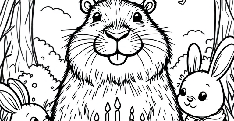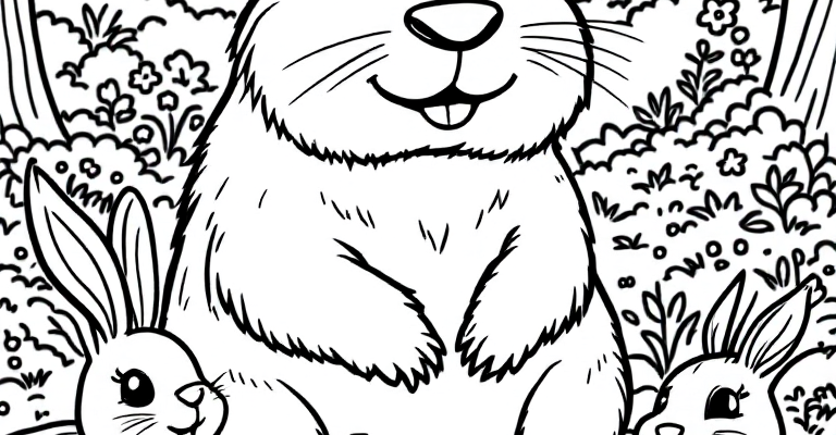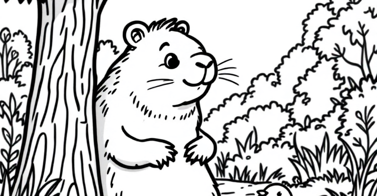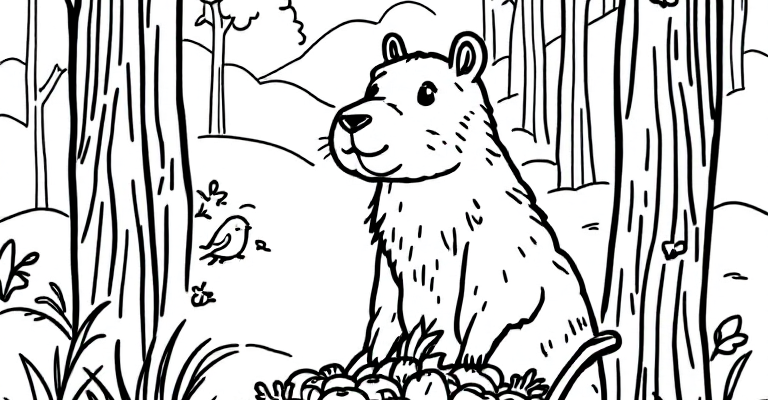 В нашем раскраске весёлая капибара помогает своим друзьям в лесу 🌳🐾 Покажи доброту и дружбу, раскрашивая эту простую и милую сцену с капибарой, зайчиком