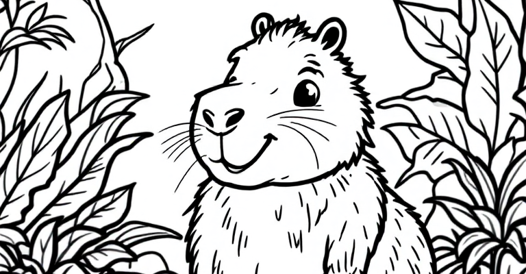 Погрузитесь в увлекательное приключение с капибарой в джунглях 🐾🌿 Эта раскраска развивает творчество и веселит детей 🖍️🌸 Простые и милые детали помогут