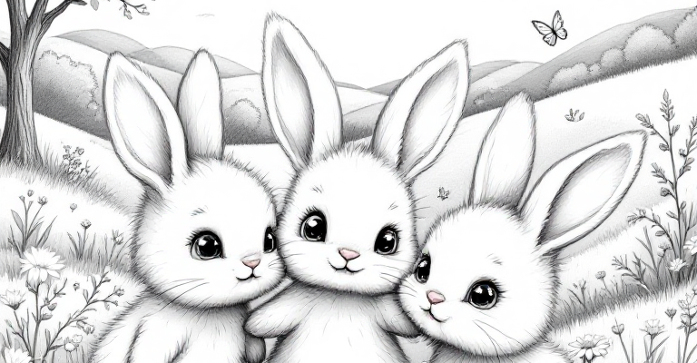 Погрузитесь в мир маленьких зайчиков в солнечном лугу где три милых зайца играют среди цветов и бабочек Этот раскраска подарит радость и вдохновение детям