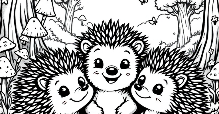 Насладитесь раскраской весёлых ёжиков в лесу с простыми и дружелюбными рисунками для детей 🦔🌼🌿 Простые контуры и милые детали помогут развить творчество