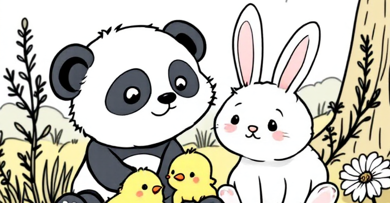 Эта страница раскраски с милыми малышами зверят идеальна для детей, ищущих детские раскраски и развивающее занятие 🐼🐥🐰🐱 Раскрашивание развивает моторику