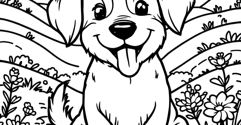 Веселая игра щенка на лугу приносит радость детям и создает настроение счастья 🌞🐶🎨 Простые черно-белые рисунки помогут малышам развить творчество и внимание