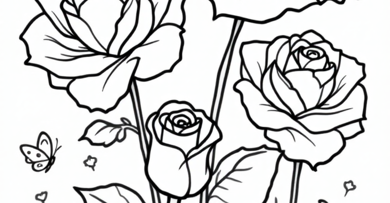 Погрузитесь в волшебный мир красивых роз с нашей раскраской 🌹 Детям понравится раскрашивать крупные бутоны и бабочек 🦋 Простые и понятные формы помогут