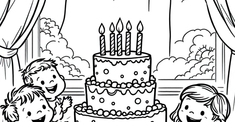 Погрузитесь в веселый мир раскрашивания с нашим простым и дружелюбным рисунком праздничного торта и подарков 🎂🎈 Отлично подходит для детей и праздничного