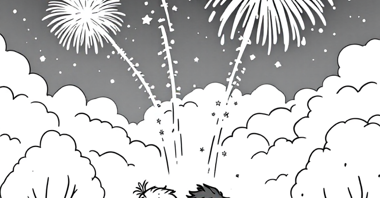 Погрузитесь в волшебство ночного неба с фейерверками и яркими звездами 🌟🎆 Идеально для детского творчества и раскрашивания, этот рисунок поможет развить