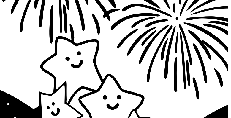 Ночной фейерверк: раскраска с улыбающимися звёздами и луной 🌙✨🎆! Весёлая ночная сцена ждёт маленьких художников! На чёрно-белом рисунке большие фейерверки