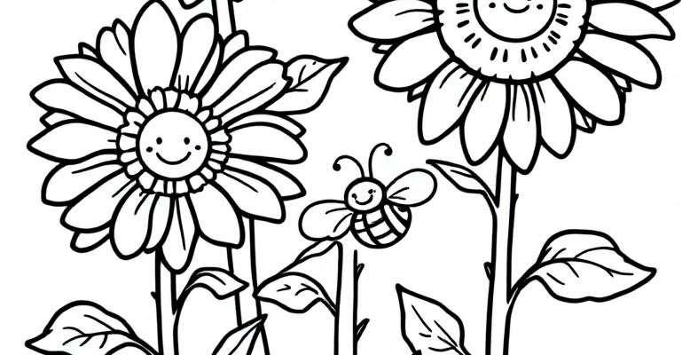 Солнечные подсолнухи и веселые пчелки для раскрашивания 🌻🐝. Откройте для себя мир творчества с этой милой раскраской! Три больших подсолнуха с круглыми