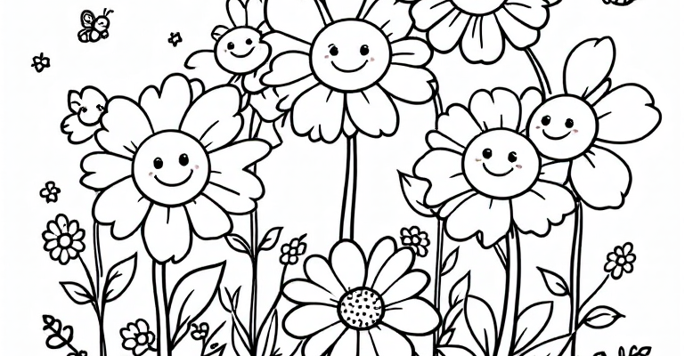 Веселая раскраска: сад с цветами, пчелками и бабочками 🌸🐝🦋 Привет, маленькие художники! Сегодня у нас чудесная раскраска с веселым садом 🌞☁️ Пять улыбающихся