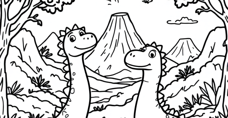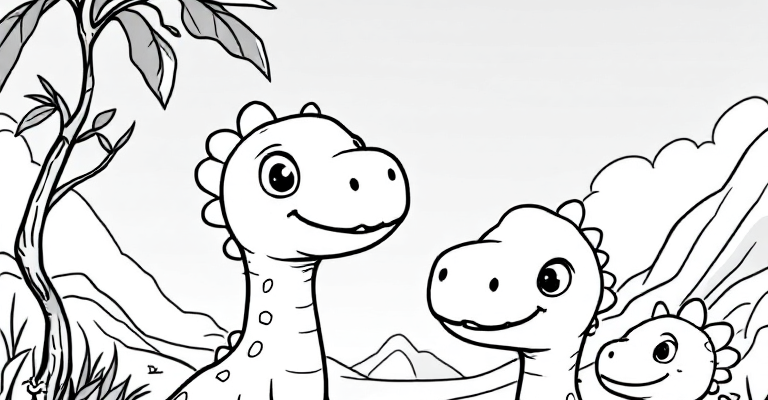 Погрузитесь в мир динозавров с нашей раскраской где дружная семья динозавров исследует волшебный доисторический лес 🌳🦕 Простые и яркие картинки для самых