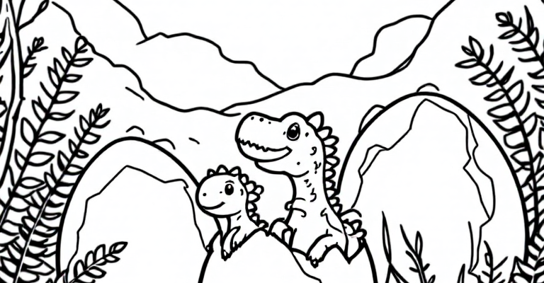 Погрузитесь в волшебный мир яиц динозавров с нашей раскраской 🦕 Веселая и простая сцена с мамой динозавром и её яйцами подарит радость детям 🎨 Развивайте