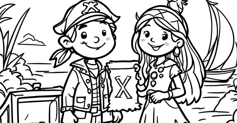 Отправляйтесь в веселое путешествие с пиратами ⚓️🏴☠️ и найдите сокровища на берегу 🌴💰 Эта черно-белая раскраска идеально подходит для детей, которые любят
