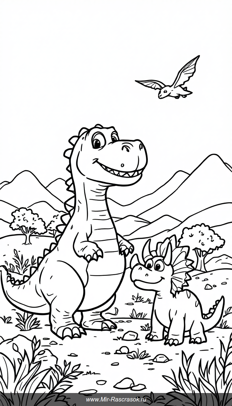 Погрузитесь в удивительный мир динозавров с веселыми раскрасками для детей 🦖🎨 Здесь три дружелюбных динозавра в простом и приятном пейзаже ждут вашего творчества 🌿🖍️ Идеально для развития фантазии и навыков рисования у малышей!