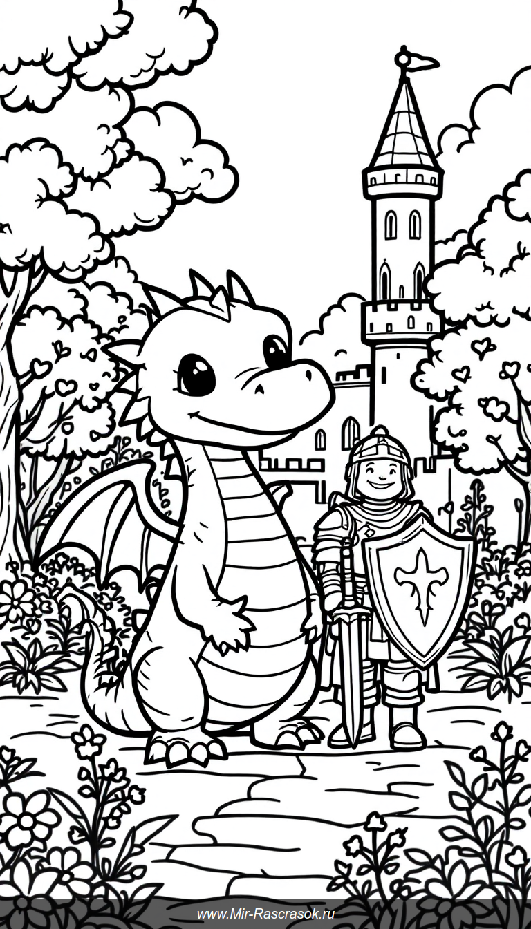Откройте для себя волшебный мир драконов и рыцарей с нашей раскраской где дружба и смелость сочетаются в забавном рисунке 🐉🛡️ Раскрашивайте вместе с детьми простые и добрые сцены замка 🌟🎨 Прекрасный способ развить фантазию и ручные навыки!