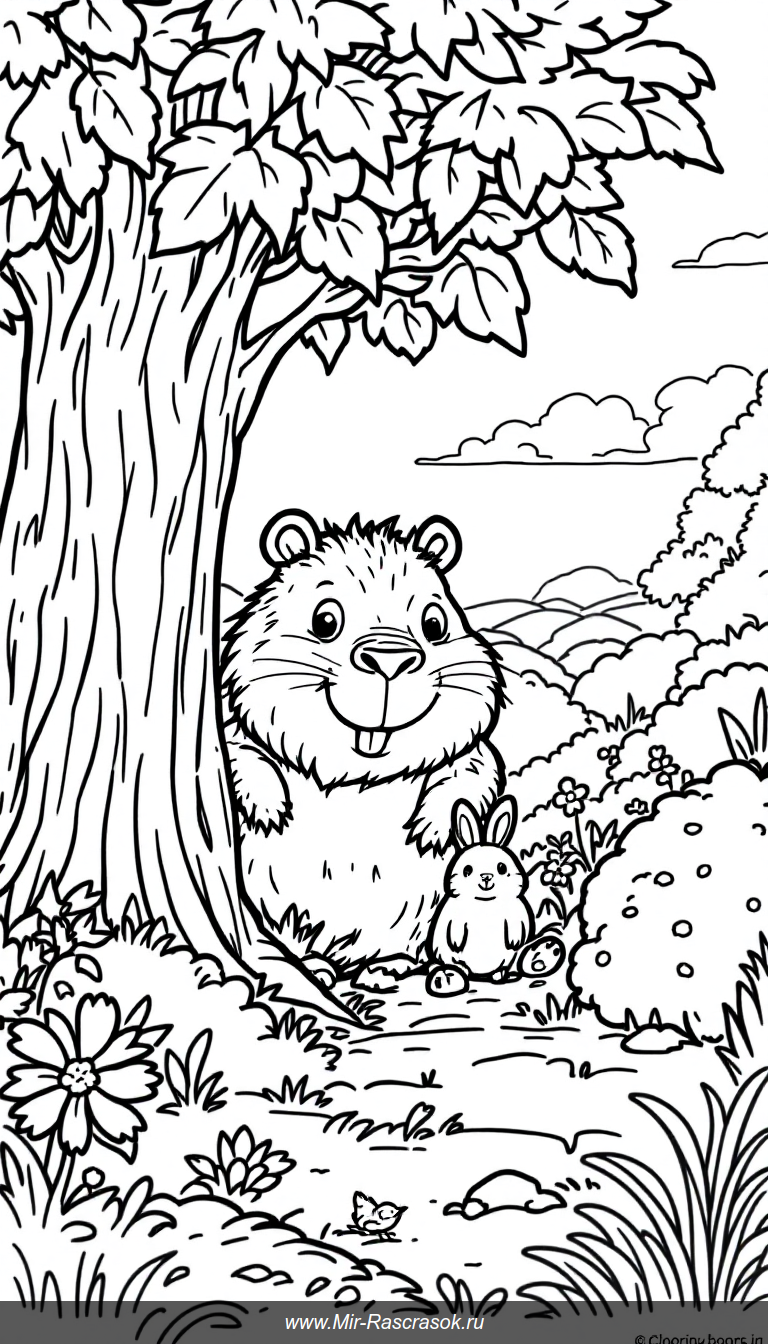 Веселая капибара играет в прятки в лесу вместе с друзьями 🦦🌿 Эта черно-белая картинка идеально подходит для детской раскраски, развивает внимание и воображение 🎨🌞
