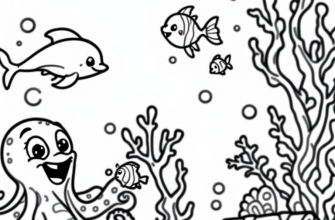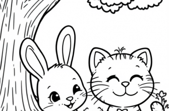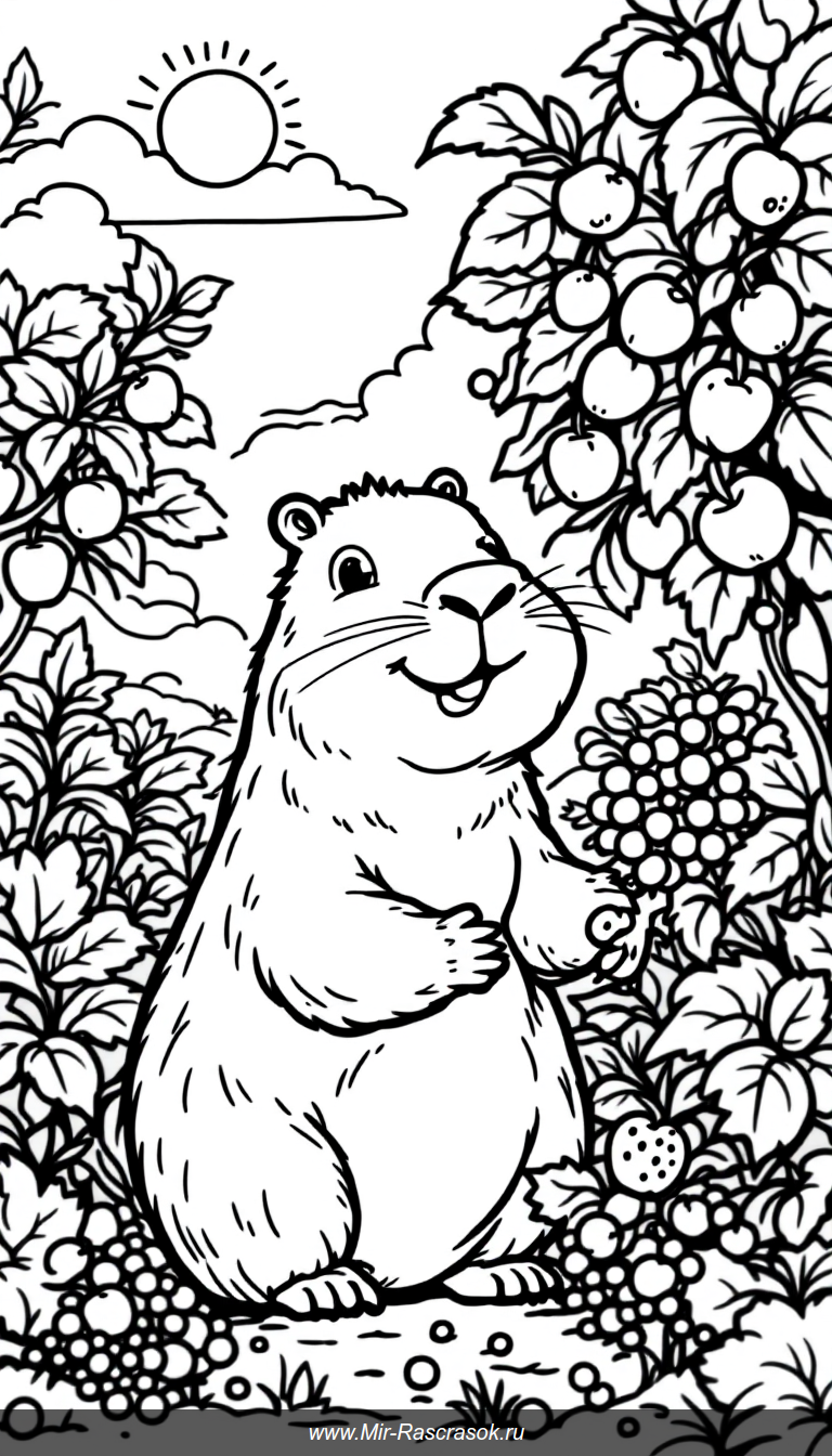 В этом милом раскраске капибара собирает вкусные фрукты и ягоды 🍓🍎, окруженная зелёными кустами и тёплым солнцем ☀️, что делает картинку простой и весёлой для раскрашивания детьми 🎨👧👦.