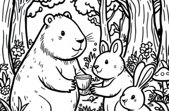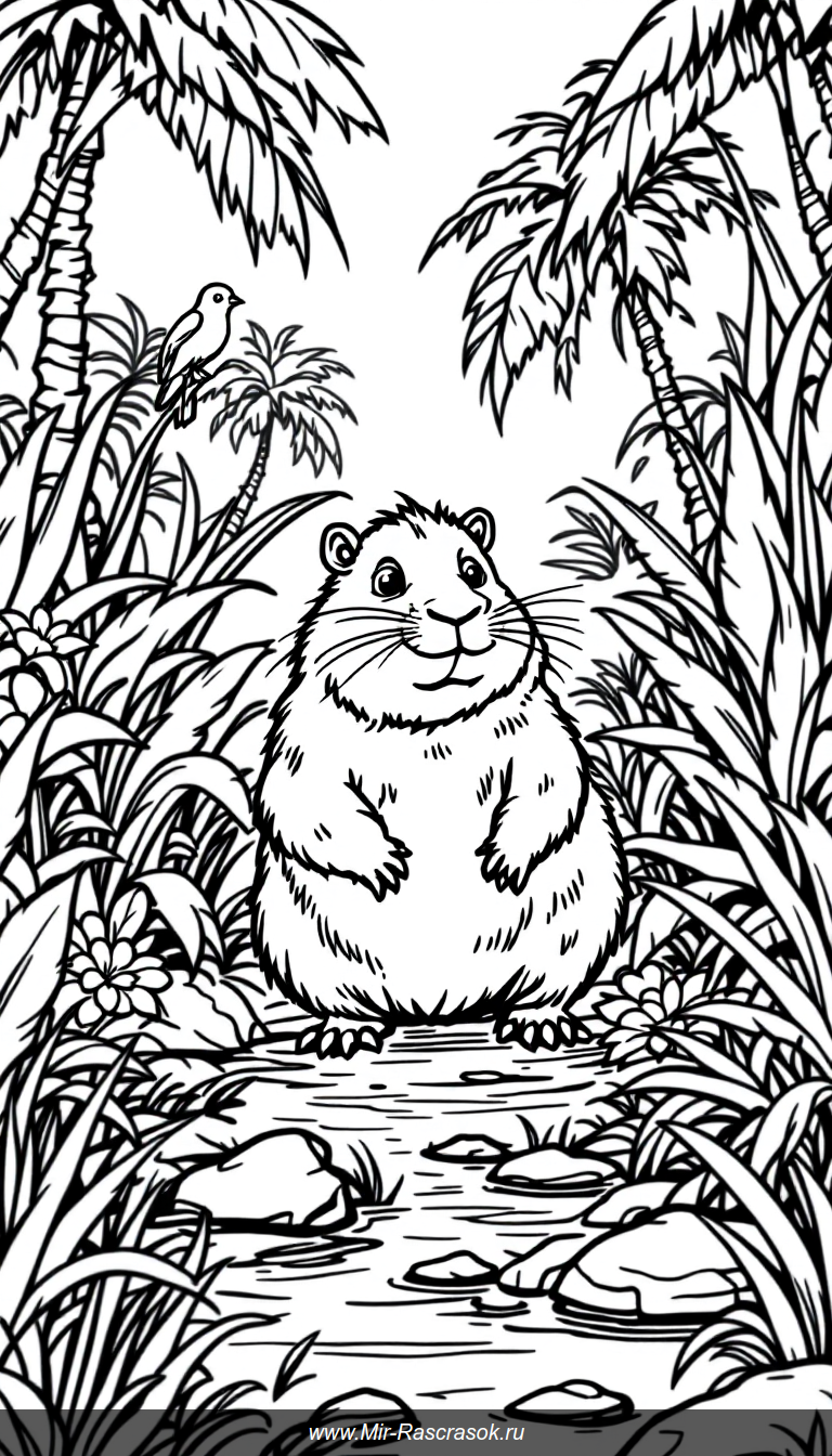 Познакомьтесь с капибарой 🐾, которая весело исследует джунгли 🌿 в раскраске для детей! Простые контуры и дружелюбные животные гарантируют увлекательное творческое занятие 🎨 и развивают воображение малышей 📚.