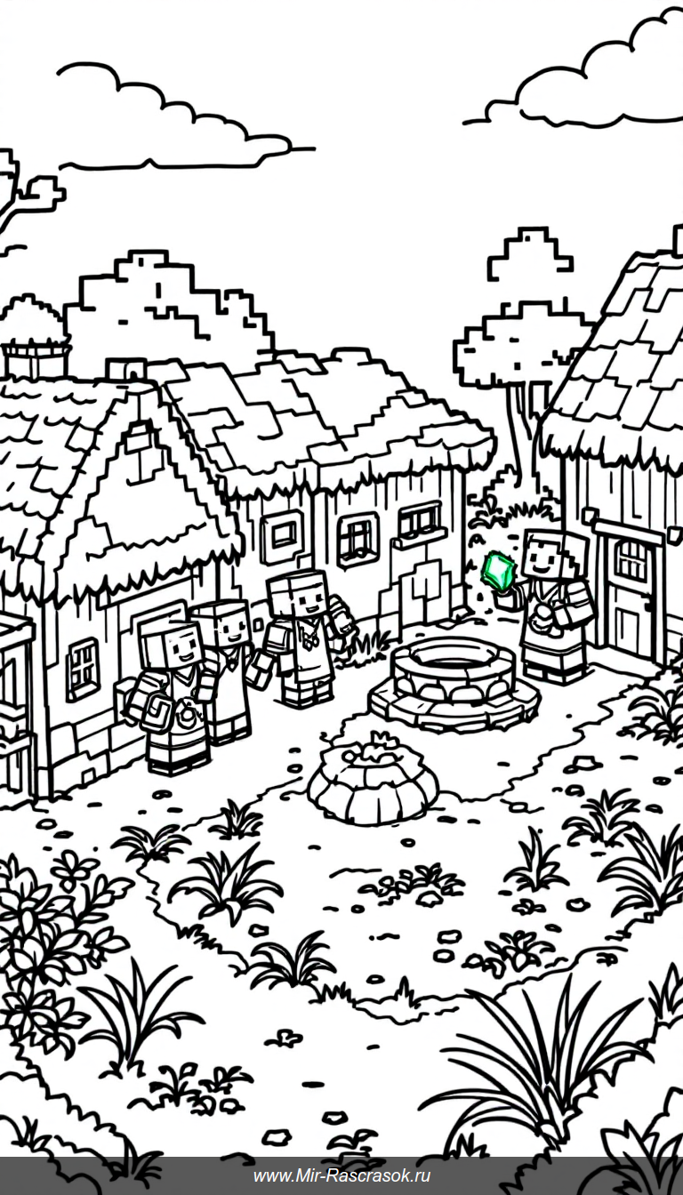 Погрузитесь в мир Майнкрафт с дружелюбными деревенскими жителями в их уютной деревне 🌾🏡 Здесь вы увидите простые дома 🏠, фермы с растениями 🌱 и улыбающихся персонажей в традиционной одежде 😊 Идеальный рисунок для детской раскраски с чёткими контурами для весёлого творчества 🎨✨