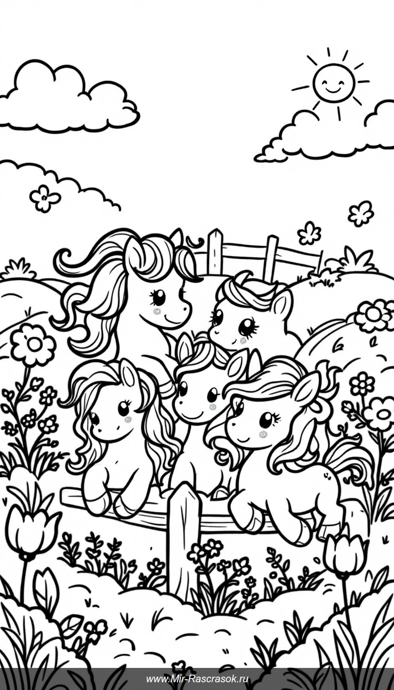 Откройте мир милых пони с нашей раскраской для детей 🐴🌼 Простые и дружелюбные сцены помогут развить фантазию и мелкую моторику 🎨❤ Наслаждайтесь цветом и весельем с нашими чёрно-белыми рисунками для малышей!