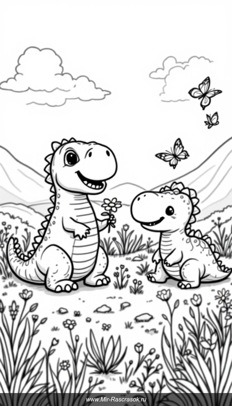 Погрузитесь в мир малышей динозавров с нашей раскраской 🌿🦕 Три дружелюбных динозаврика играют на лугу среди цветов и бабочек 🦖 Сделайте процесс творчества веселым и развивающим для вашего малыша 🖍️ Отлично подходит для раннего обучения и веселых минут вместе 🎨