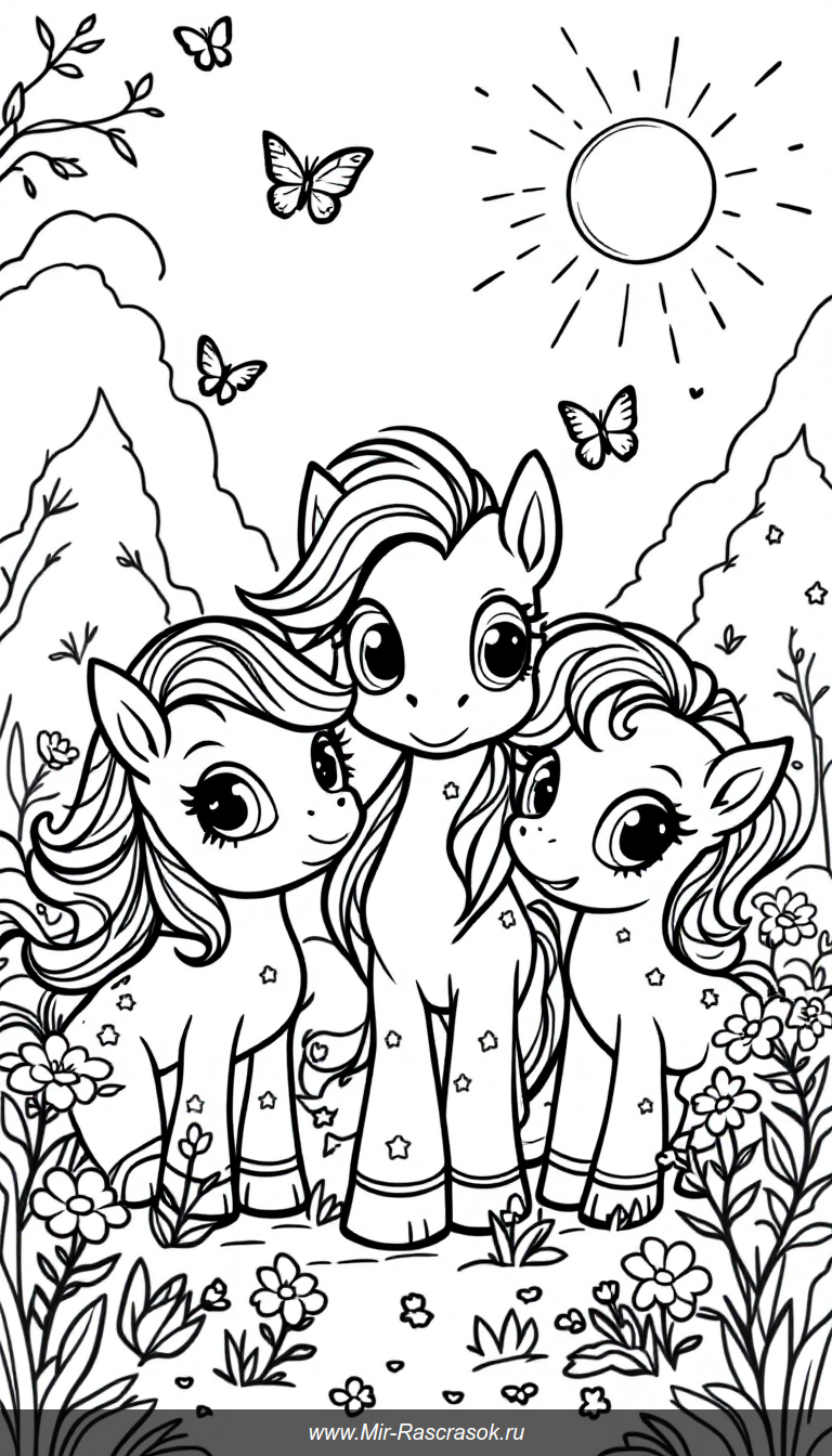 Погрузитесь в мир милых пони на нашей раскраске где три дружелюбных пони играют в цветущем лугу с бабочками и солнцем 🌞🐴🌸 Идеально для детей которые любят яркие и простые рисунки для творчества и развития мелкой моторики 🎨✨