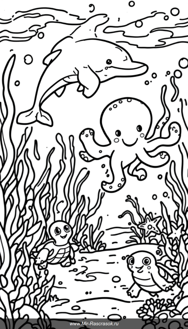 Погрузитесь в мир подводных друзей с нашей раскраской где доброе дельфин с улыбкой плавает рядом с веселым осьминогом и черепашкой 🐬🐙🐢 Раскрашивайте звездочек и забавных крабов на морском дне развивая фантазию и мелкую моторику детей 🌟🦀 Наслаждайтесь простыми и радостными рисунками для малышей!