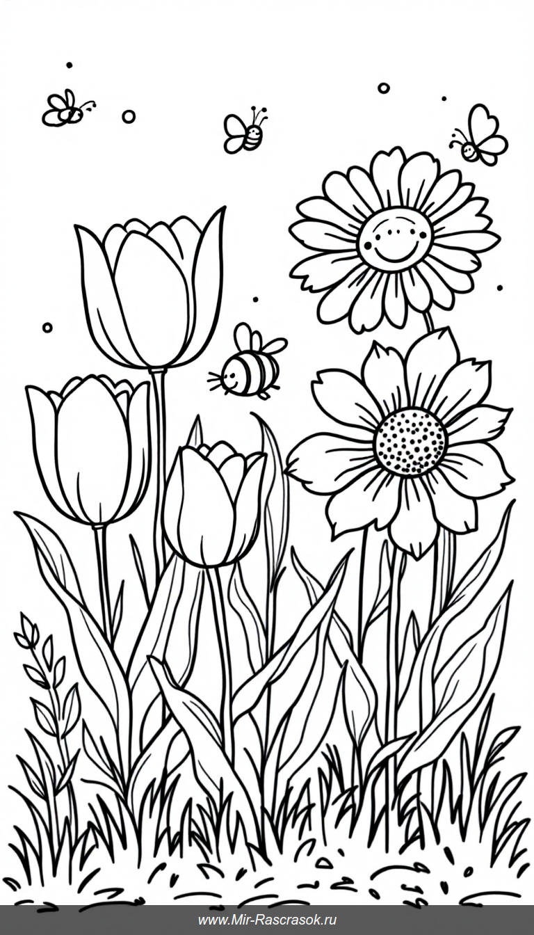 Погрузитесь в мир простых цветов для раскраски 🌸 с большими тюльпанами, ромашками и подсолнухами 🌼 идеально подходят для детей 🐝 веселые пчелки и бабочки добавляют радость 🎨 создайте свой яркий сад легко и весело