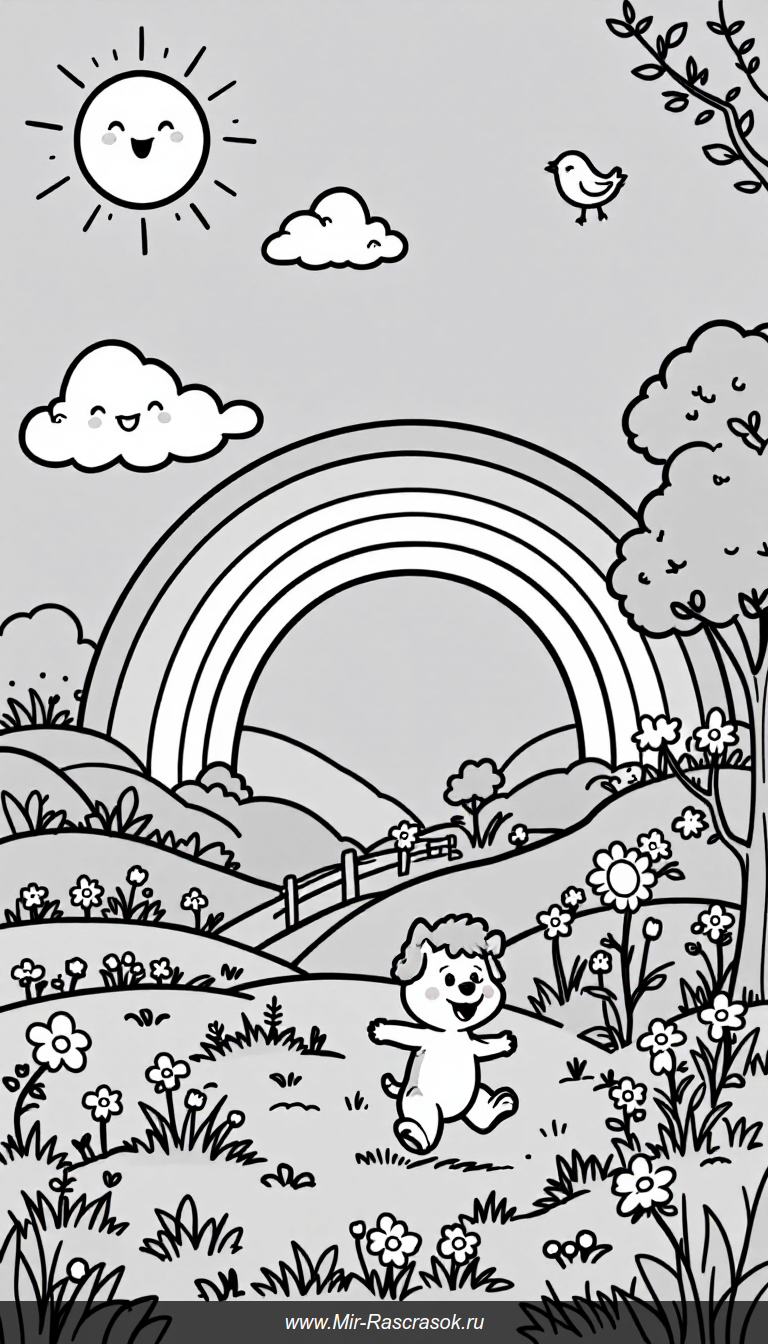 Радужная раскраска с веселыми детьми и забавным щенком подарит радость и веселье малышам 🌈! Простые линии, крупные объекты и яркие образы помогут детям легко освоить творчество 🎨. На картинке детки играют на лугу с цветочками 🌸 и веселым щенком 🐕 под ярким солнцем ☀️, радуга наполняет день счастьем! Идеально для развития фантазии и моторики маленьких художников 👧👦! Попробуйте и вы эту сказочную раскраску 😊!