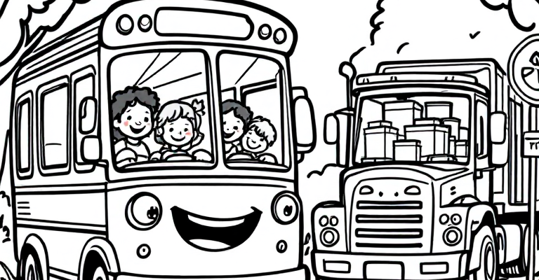 Погрузитесь в увлекательный мир грузовиков и автобусов с нашей яркой раскраской 🚌🚚 Весёлые персонажи, простые линии и добрые сюжеты помогут вашим детям