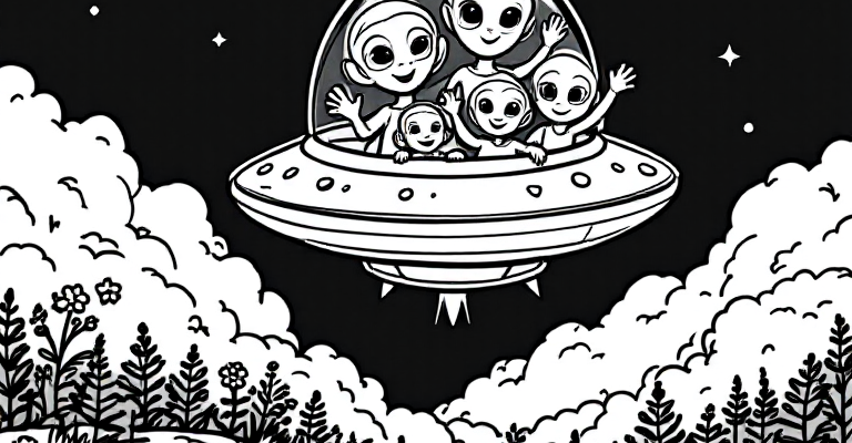 Познакомьтесь с дружелюбными пришельцами и их летающей тарелкой на нашем черно-белом раскраске для детей 👽🛸 Рисунок простой и позитивный, чтобы малыши