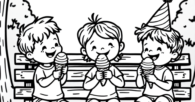 Погрузитесь в мир радости с нашим раскраской Улыбки с мороженым Помогите детям раскрасить веселых детей, наслаждающихся мороженым на скамейке в парке Это