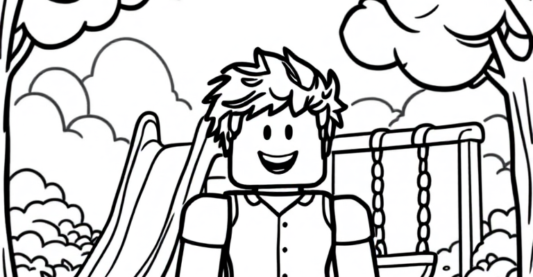 Погрузитесь в мир Roblox с нашей раскраской для детей 🎨🌞 Простая и яркая сцена с героями и игровой площадкой поможет развить фантазию и творческие навыки
