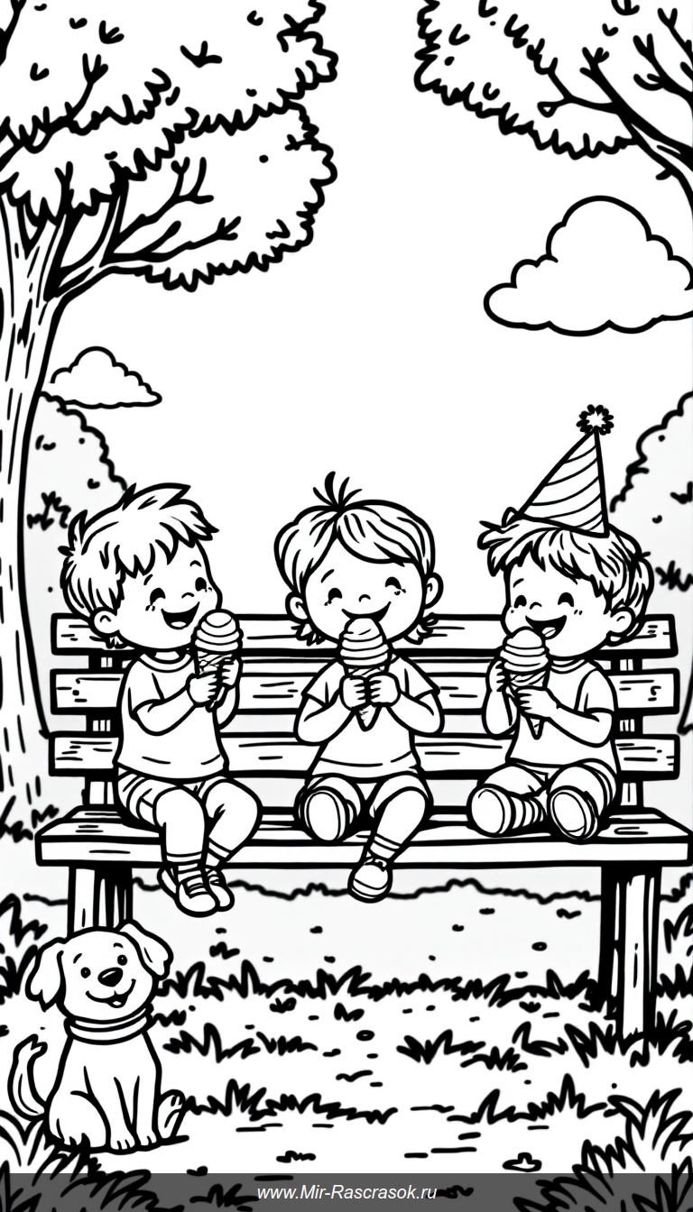 Погрузитесь в мир радости с нашим раскраской Улыбки с мороженым Помогите детям раскрасить веселых детей, наслаждающихся мороженым на скамейке в парке Это веселое и позитивное изображение вдохновит на творчество и подарит улыбки всей семье