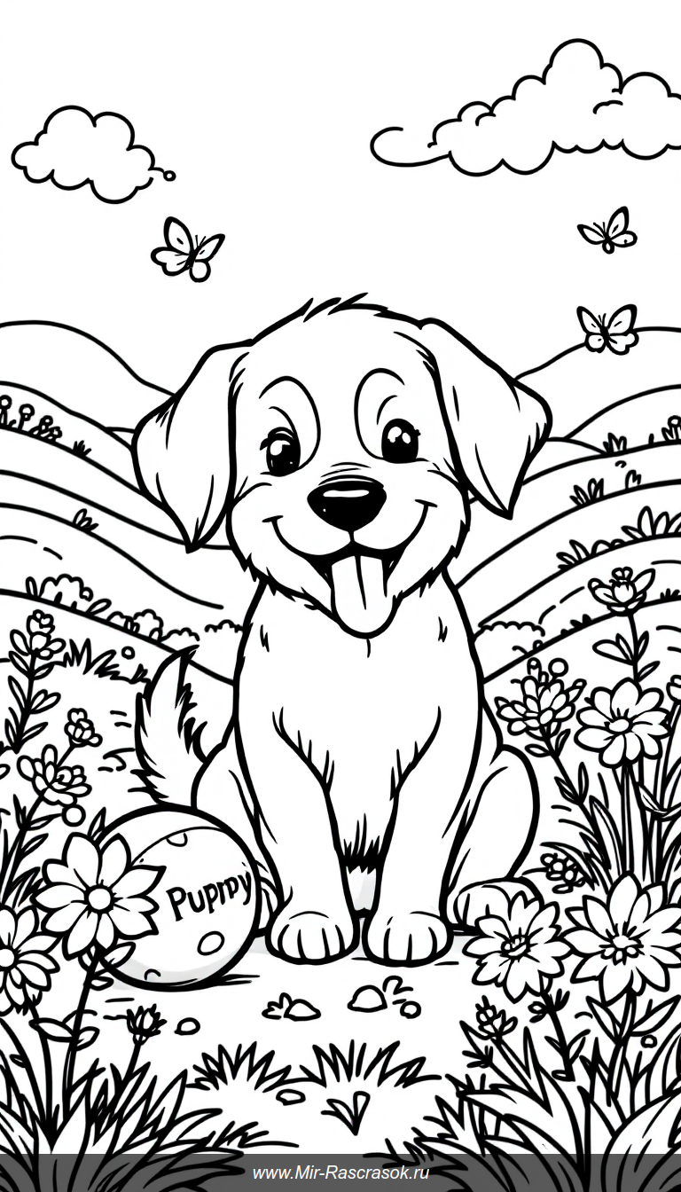 Веселая игра щенка на лугу приносит радость детям и создает настроение счастья 🌞🐶🎨 Простые черно-белые рисунки помогут малышам развить творчество и внимание к деталям 🌼🦋 Идеально для раскраски дома или в детском саду, создавая уют и позитив!