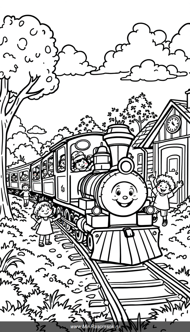 Погрузитесь в веселые приключения на поезде с нашей раскраской для детей 🚂🌳 Простые яркие линии и дружелюбные персонажи помогут развить творчество и подарят море положительных эмоций 🎨👧🧒