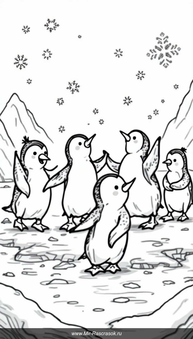 Погрузитесь в мир радости с нашей раскраской Веселые танцующие пингвины дети смогут раскрасить милых пингвинчиков на льду под падающим снегом это развивает творческие способности и приносит массу удовольствия Раскрашивание помогает мелкой моторике и воображению Присоединяйтесь к веселью вместе с нашими очаровательными персонажами