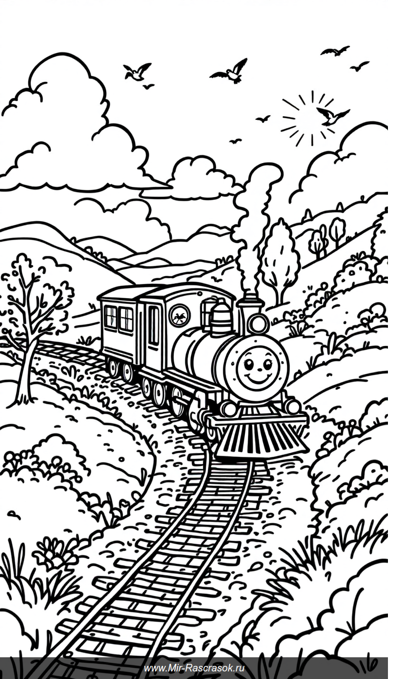 Веселый паровозик в детской раскраске приглашает малышей в мир радости и творчества 🚂🌞 Простые яркие контуры и улыбающееся лицо поезда помогут детям легко и с удовольствием раскрашивать картинку 🎨 Дружелюбный паровозик едет по холмам, мимо пушистых деревьев и маленькой станции с машущими ребятами 🐦🌳 Это отличная возможность развить воображение и мелкую моторику у малышей, создавая яркие истории вместе с любимым паровозиком! Начинаем яркое путешествие прямо сейчас!✨😊