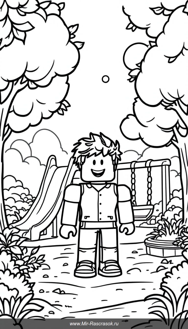 Погрузитесь в мир Roblox с нашей раскраской для детей 🎨🌞 Простая и яркая сцена с героями и игровой площадкой поможет развить фантазию и творческие навыки ваших малышей 😄🖍️ Идеально для весёлого и полезного досуга дома или в школе!