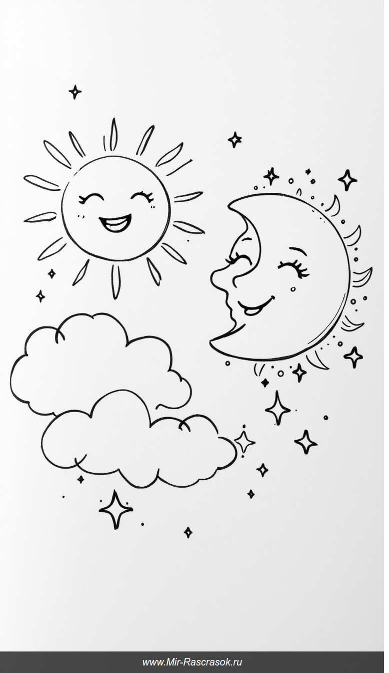 Весёлое солнце ☀️ и спокойная луна 🌙 приглашают детей в увлекательный мир раскрашивания 🎨 Этот милый черно-белый рисунок с простыми линиями и большими пространствами идеально подходит для малышей 👧🧒 Солнце улыбается ярко, лучики светят радостно, а луна с закрытыми глазами и нежной улыбкой создаёт атмосферу уюта и покоя 🌟 Между ними плывут пушистые облака ☁️ Весёлое творчество гарантирует улыбки и спокойствие, развивая фантазию и моторику! Попробуйте раскрасить вместе с детьми эту добрую сказку 🎉🖍️