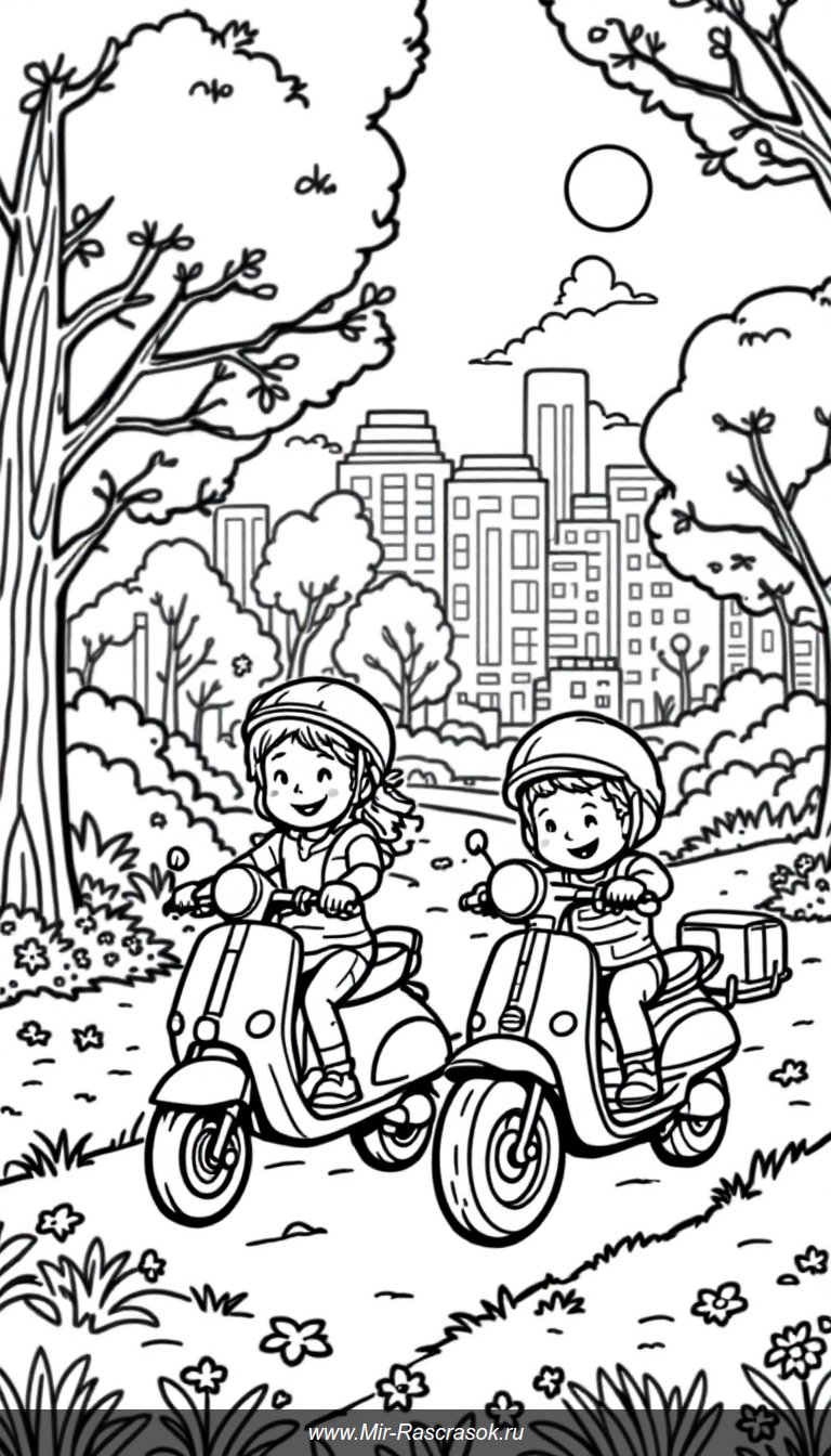 Погрузитесь в мир веселья с нашими раскрасками мотоциклов и скутеров 🎨🛵 Эта простая и забавная сцена понравится детям любого возраста, развивая фантазию и моторику 🎉🌟