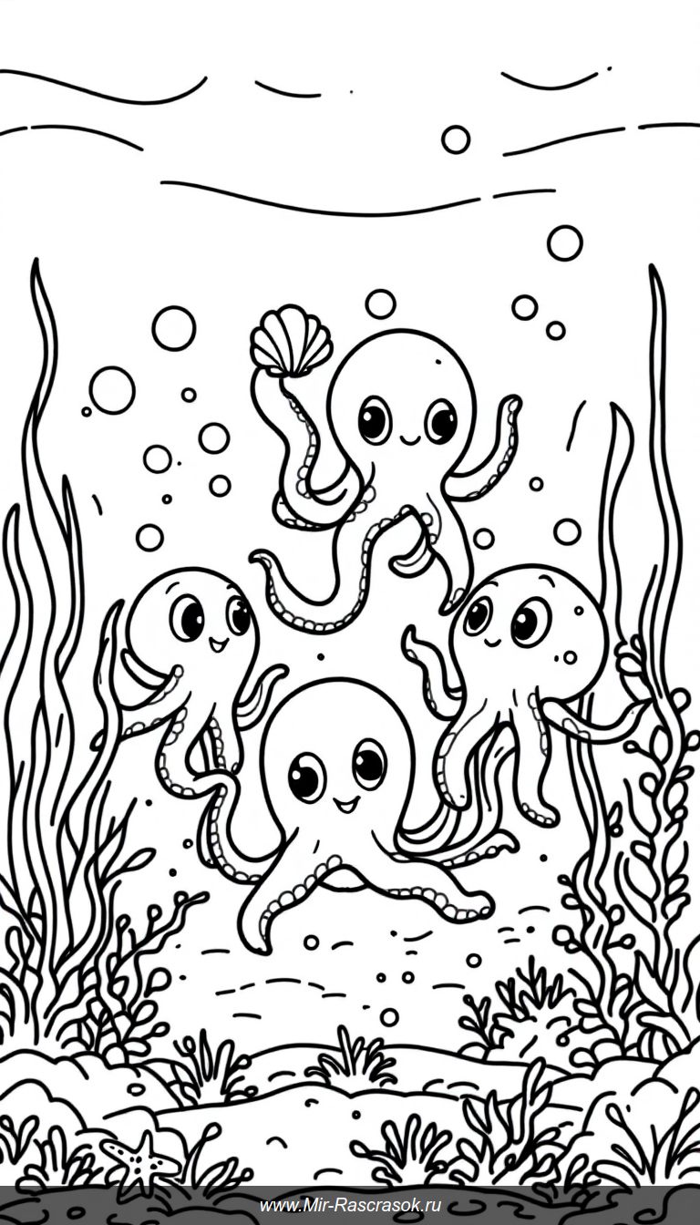 Познакомьтесь с весёлыми осьминожками друзьями в нашей раскраске для детей 🐙🖍️ Простая и забавная картинка несёт радость и творческий настрой для малышей 🌈🎨 Порадуйте ребёнка увлекательным занятием в море улыбок и фантазии