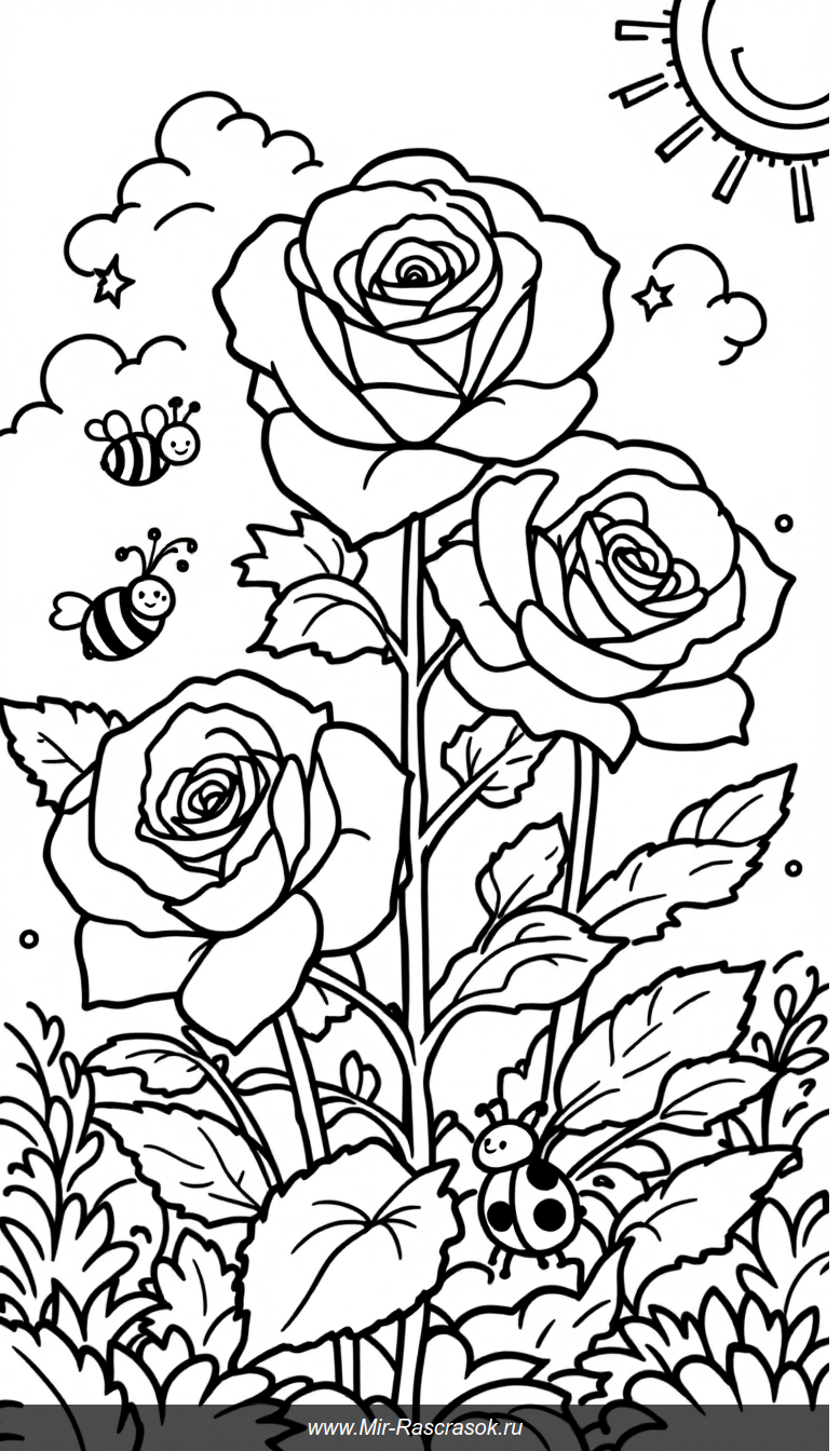 Весёлый сад: розы, пчёлки и божья коровка для раскрашивания 🌸🐝🐞 Привет, юные художники! Сегодня у нас чудесная раскраска с садом 🌞 На картинке три красивые розы с лепестками и листьями, вокруг летают улыбающиеся пчёлки, а на листике сидит весёлая божья коровка! ☁️ На небе пушистые облака и улыбающееся солнышко. Все контуры чёткие, чтобы легко раскрашивать! Берите карандаши, фломастеры и творите! 🎨 Какого цвета будут ваши розы? Жёлтые, красные или розовые? А пчёлки и божья коровка? Включайте фантазию! Удачи! ✨