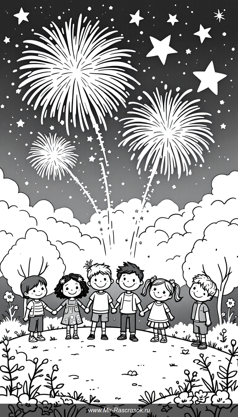 Погрузитесь в волшебство ночного неба с фейерверками и яркими звездами 🌟🎆 Идеально для детского творчества и раскрашивания, этот рисунок поможет развить воображение и подарит радость каждому малышу 🌈👧🧒 Попробуйте раскрасить эти простые и веселые сцены уже сегодня